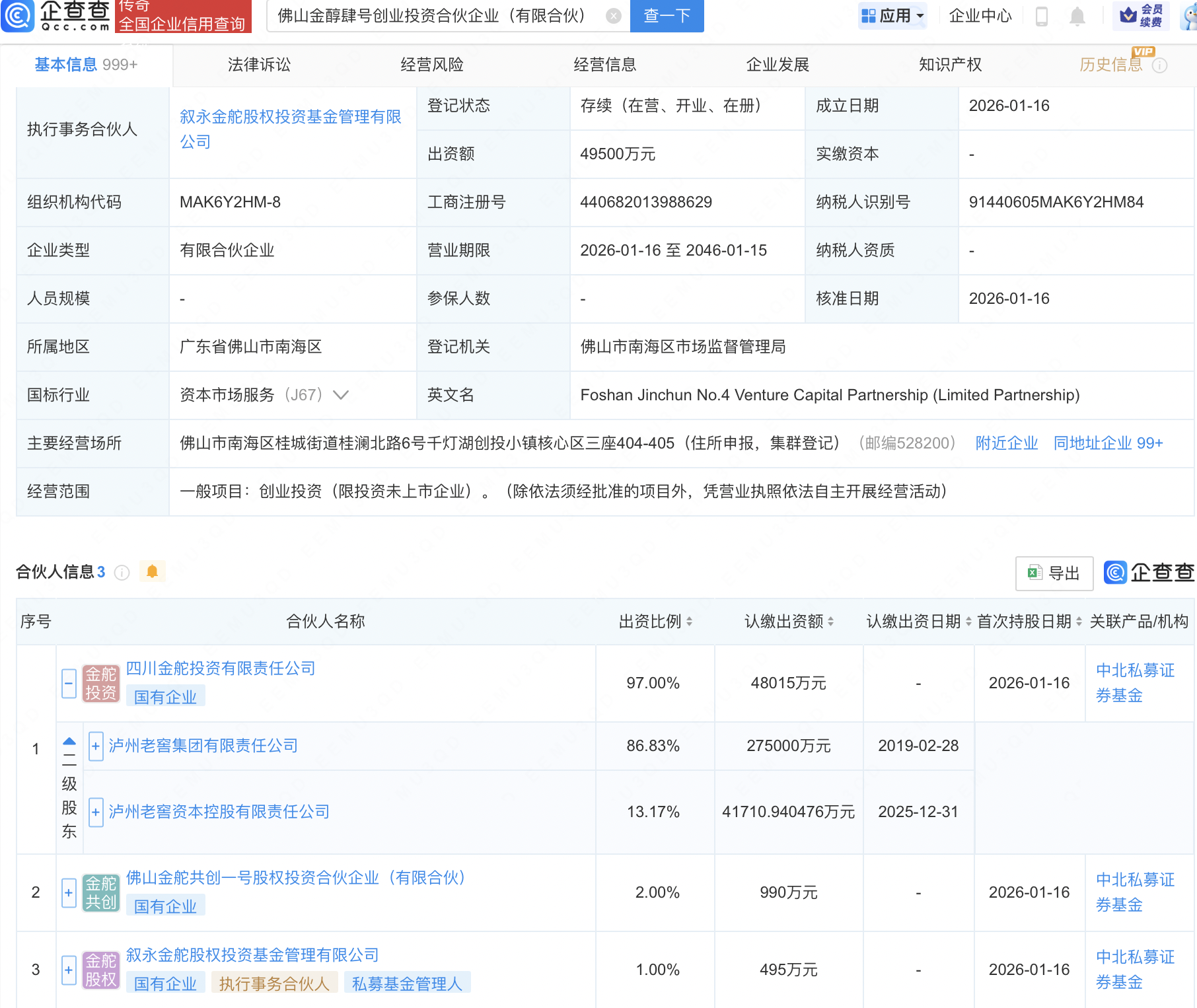 近日,佛山金醇肆号创业投资合伙企业(有限合伙)成立,出资额4.95亿元,经营范围包含:创业投资(限投资未上市企业)。企查查股权穿透显示,该企业由泸州老窖集团有限责任公司旗下四川金舵投资有限责任公司等共同出资。